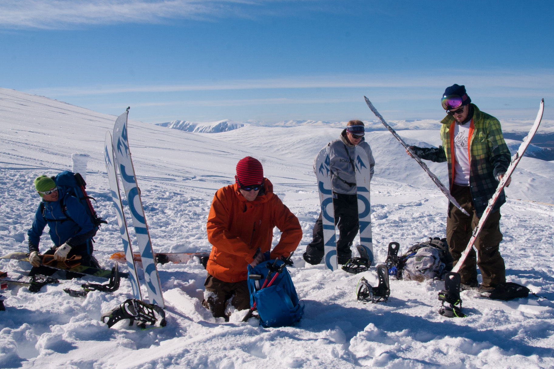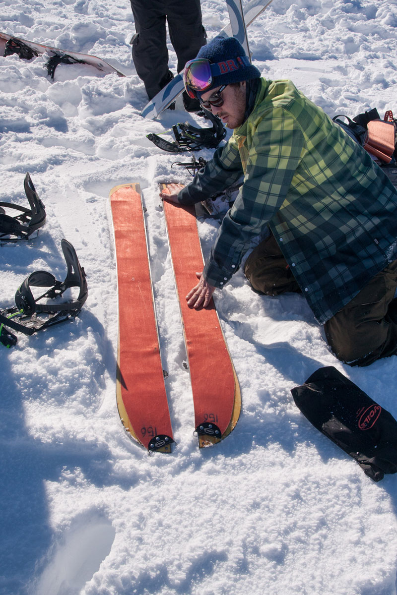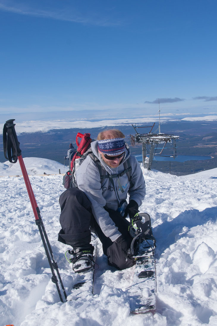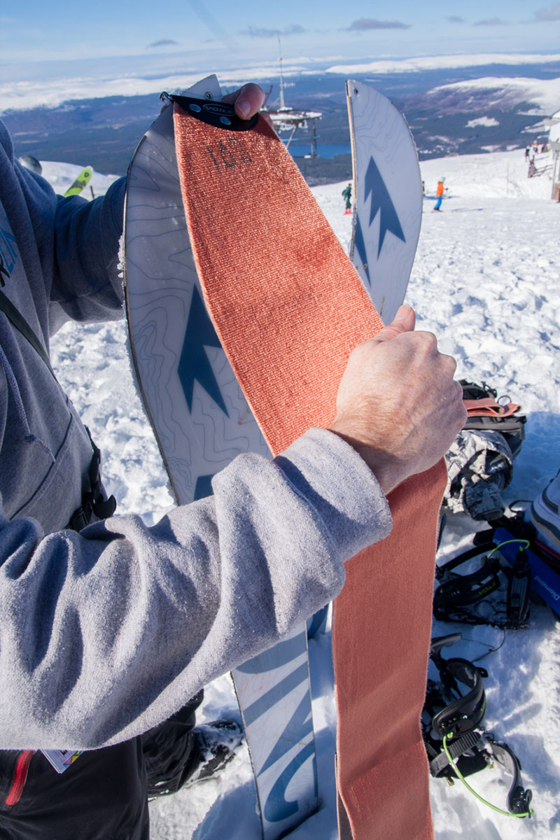 Just as ideal are the conditions; not a cloud in the sky, barely a breath of wind, and plenty of fresh lines still up for grabs in the Cairngorm backcountry. We’re champing at the bit, but there’s plenty to be done before we can hit the hill. Setting up our boards is the obvious first step – a fidgety process, but definitely made easier by having an experienced splitter on hand to point out common mistakes and assist with fine-tuning.