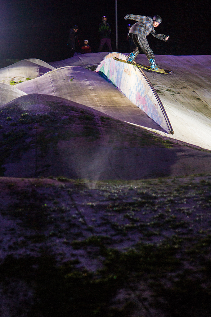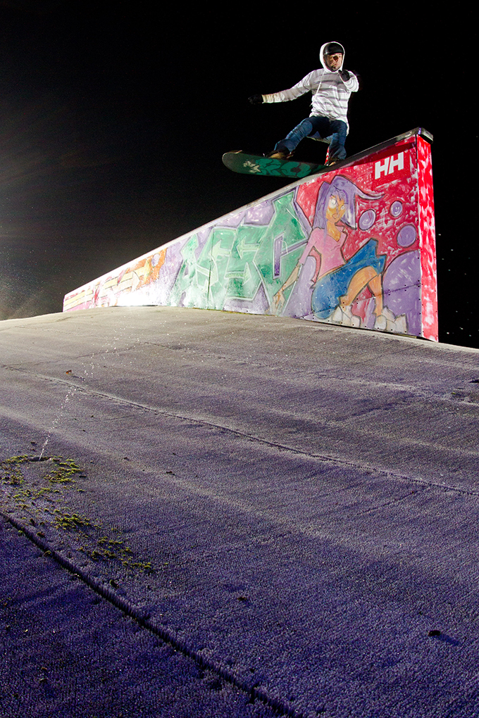 The kicker at Garthdee has a great shape and has what I think is the longest landing in the UK, which has been put to good use over the years. The new management and club partnership (no more sneaking over the fence to ride in the dark) has led to a huge growth in access to snowboarding for the local groms. Nicol Paton, Barry Parker, Matt Gibson and now Kris Bell have played no small part in creating an infectious environment. The results are kids like Fin Bremner, who’s starting to take dry slope riding up another notch. Fin’s not only technically pushing it, but also growing into his snowboarding and developing some really solid style too. Keep an eye out for him, if you’re not already.