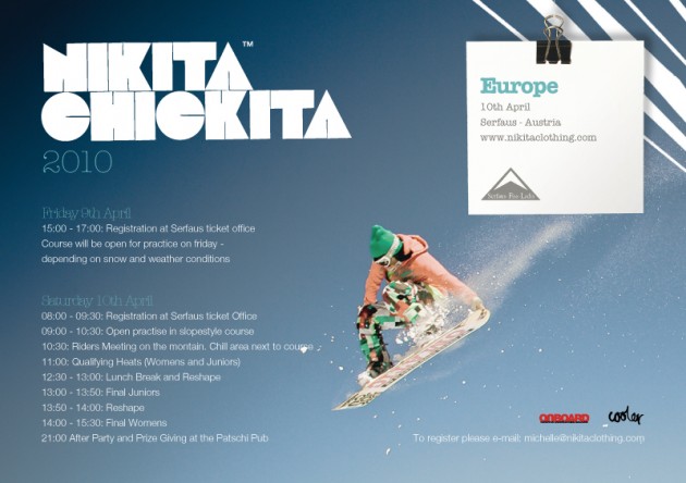 Nikita are once again running their chilled out freestyle comp for the ladies and it’s ploughing through Europe in style. The Swiss leg of the european comp went down on the weekend and the Norway and Scandi Legs are coming up soon. Winner’s from each of the tour legs get a chance to ride at Nikita Chikita Europe which goes down on the 10th April in Serfaus. For pre-registration for the Serfaus leg email [email protected] with all your details (name, age, DOB, phone and email) and any sponsors. There is a juniors’ and women’s event and all winners receive sexy jam packed goody bags (with a bit of cash for the grown ups) and women’s first place also gets a years sponsorship from Nikita.