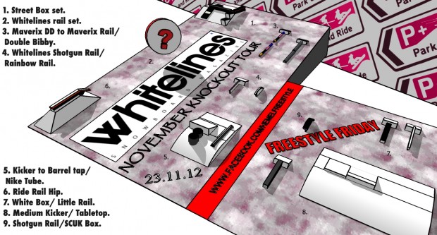 So we’re now past the halfway point on our 4 legged beast of a rail jam tour and we’re not planning on slowing down any time soon. The last two stops at Hemel and Milton Keynes could very well be two of the biggest and to say we’re biting our nails with apprehension is an understatement – even more so when Alex Tank will be in attendance shredding the rails and scouting for one talented UK jibber to invite out to this season’s Head Jib Factory. We’ve just been sent the park plan and it’s looking rather boshty to say the least: