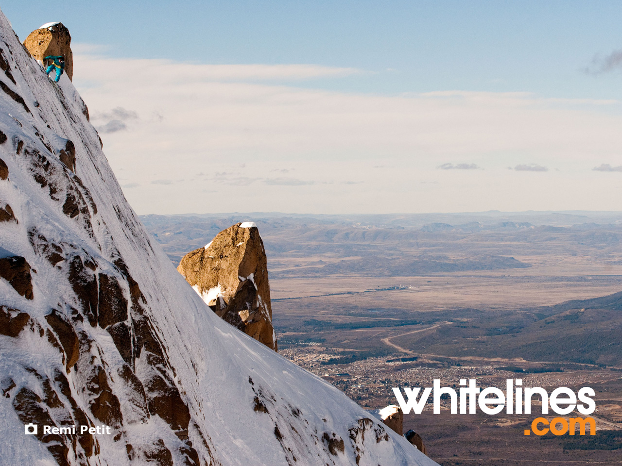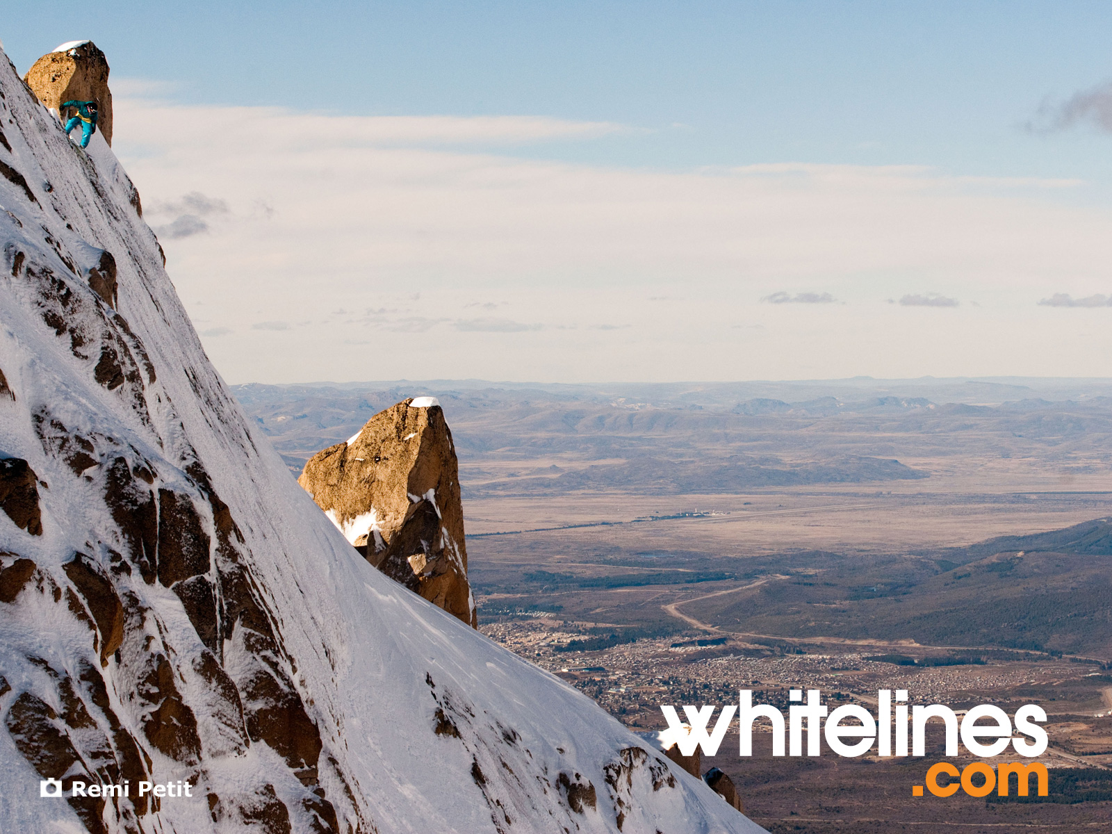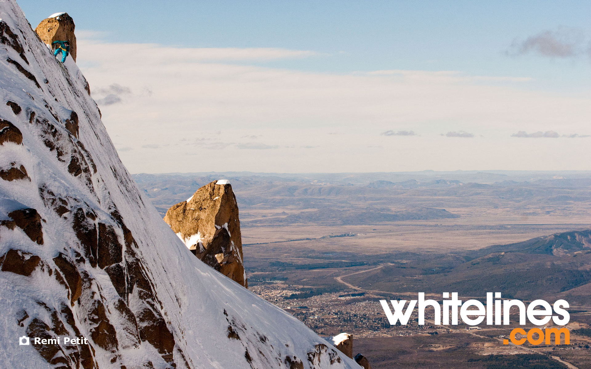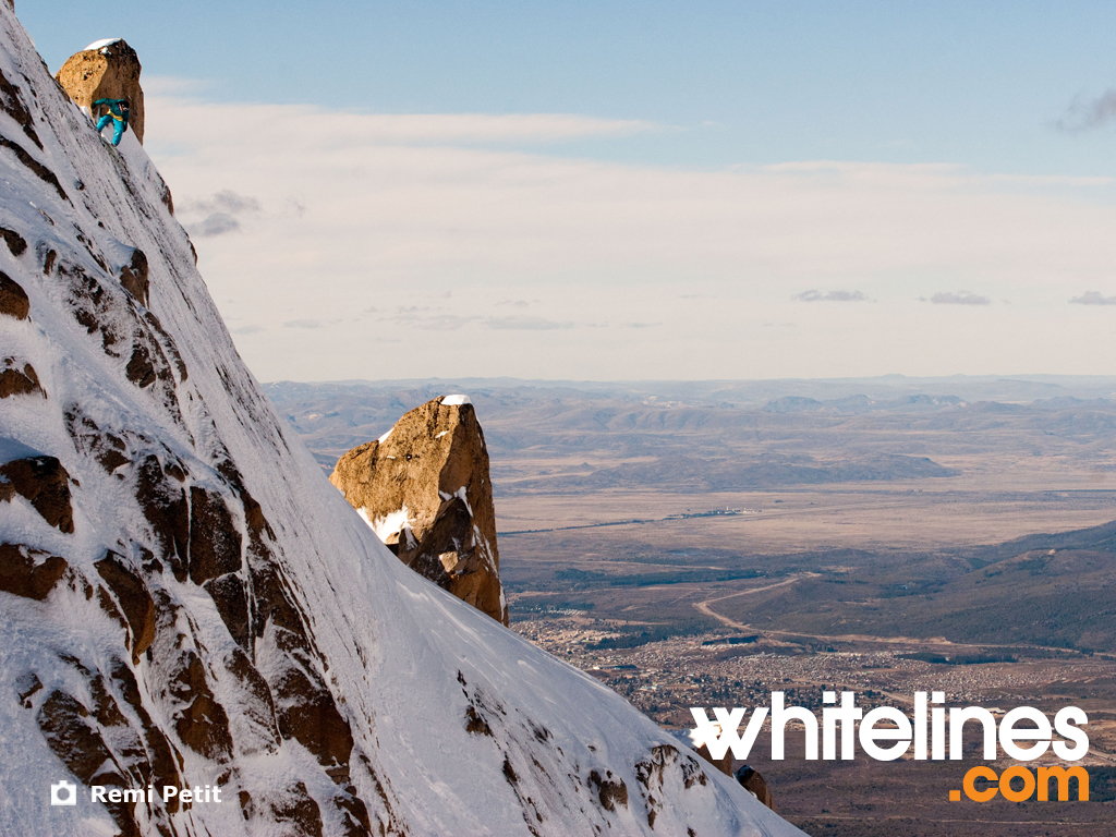 Since it’s mid summer we thought we’d brighten up your desktop with a fresh snowboard wallpaper from the southern hemisphere. This sheer rockslide lies just off the piste in Cerro Catedral, Argentina. Victor de le Rue, in the fine tradition of French ‘extreme sport’ mentalists, straps his nads on and sends it.