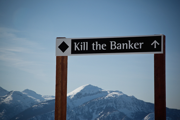 Nevertheless, after a few beers and an ice hockey match at the ‘Last Drop’ pub we’re feeling positive, and the next morning we head up the new gondola to see why this place has attracted so many big name pros over the past few years. The slopes are blissfully empty, and we spend a fun few hours getting our legs back by charging down runs with the kind of amusing names you only get in North America; runs like ‘Ripper’, ‘Stoked’ and (my post credit crunch favourite) ‘Kill the Banker’. There are some impressively long descents here, including a home run that winds down through massive evergreens for nearly 10km. As for the freeriding, we can certainly see the potential: the pitch in Revelstoke is consistently steep, and a short hike over the summit ridge brings us to the North Bowl, a giant shadowy crater that offers numerous routes through cliffs, pillows and open lines, all of which funnel back down into those massive trees. The only problem is, there are more tracks than an iTunes Beatles promotion. Yes the hill might be quiet, but that’s only because the locals appear to have rinsed the powder weeks ago and disappeared home to wait for the next dump.
