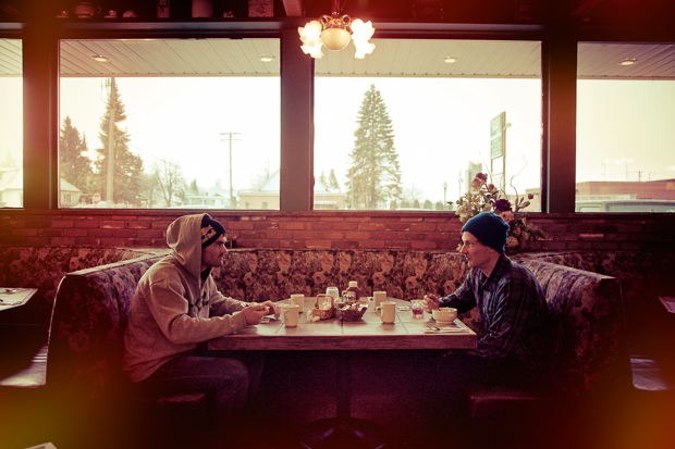 Weather-wise, though, things don’t look much more promising as we head towards the pickup location. The valleys are bare, the sun is out and to be honest it feels more like spring than February. At the backwater hamlet of Cherryville, we pull into a run down golf course and meet our driver – an old, plaid-shirted dude with a grey moustache called George, who’s tucking into a bowl of chilli as he waits for a new round of guests to arrive. We also meet Jon Cartwright, a legendary former pro rider from Vancouver who’s now heading up Westbeach’s Canadian operations.