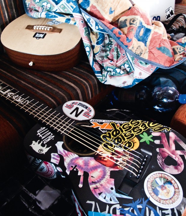 Right now I have a guitar I bought in Japan, in Tokyo, the name is Greco, I think it’s like a Japanese make. It’s a really sick guitar and it has like a sun in the middle… wait, I’ll go grab it. [picks up hippy-looking acoustic guitar and picks out a bluesy riff ]