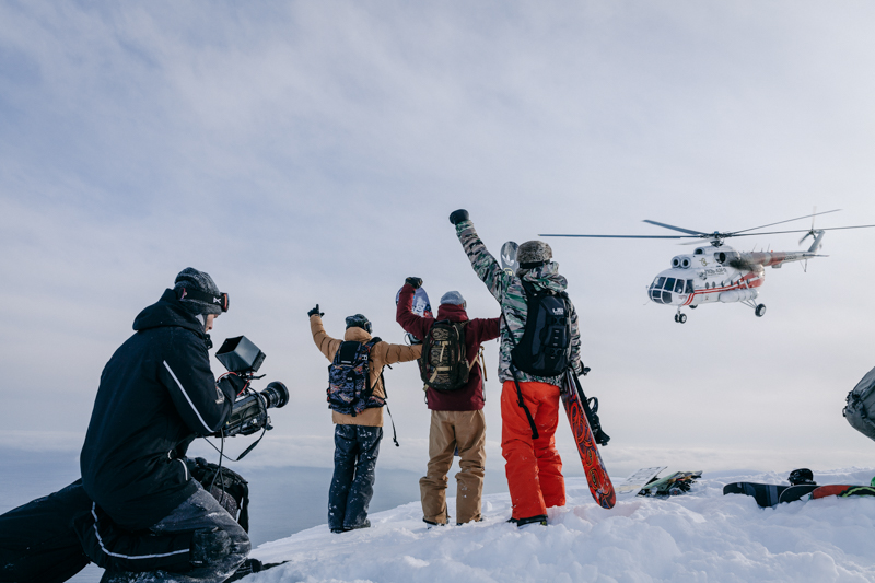 Cameras and Helis. Greg Wheeler shoots Travis Rice, Mark Landvik & Eric Jackson in Russia. Photo: Scott Serfas/Red Bull Content Pool.