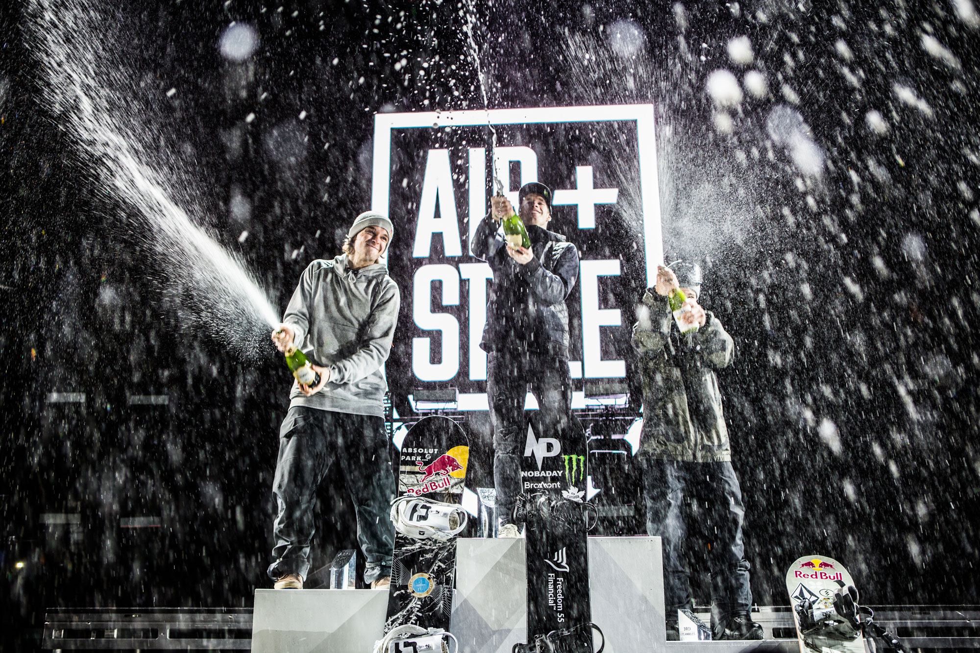 The Podium of Power. L to R: Seppe Smits, Max Parrot, Marcus Kleveland. All over the place and in Sami's photo rig: Champagne. Or maybe Prosecco. Who knows?