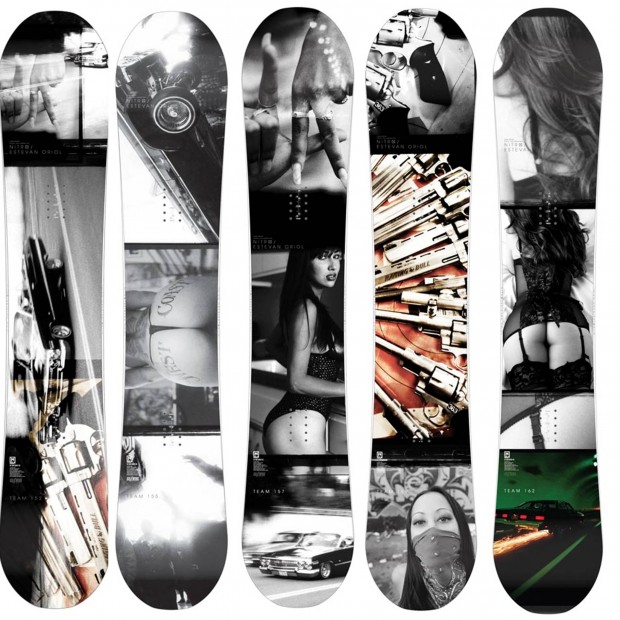 ‘If you like chicks, guns, cars, man sh*t, and you like snowboarding, then you’re in luck’ is what Nitro Team Manager Knut Eliasson had to say about these boards, and I think he sums it up rather well. Nitro teamed up with LA based photographer Estevan Oriol for these graphics, and they look damn good.