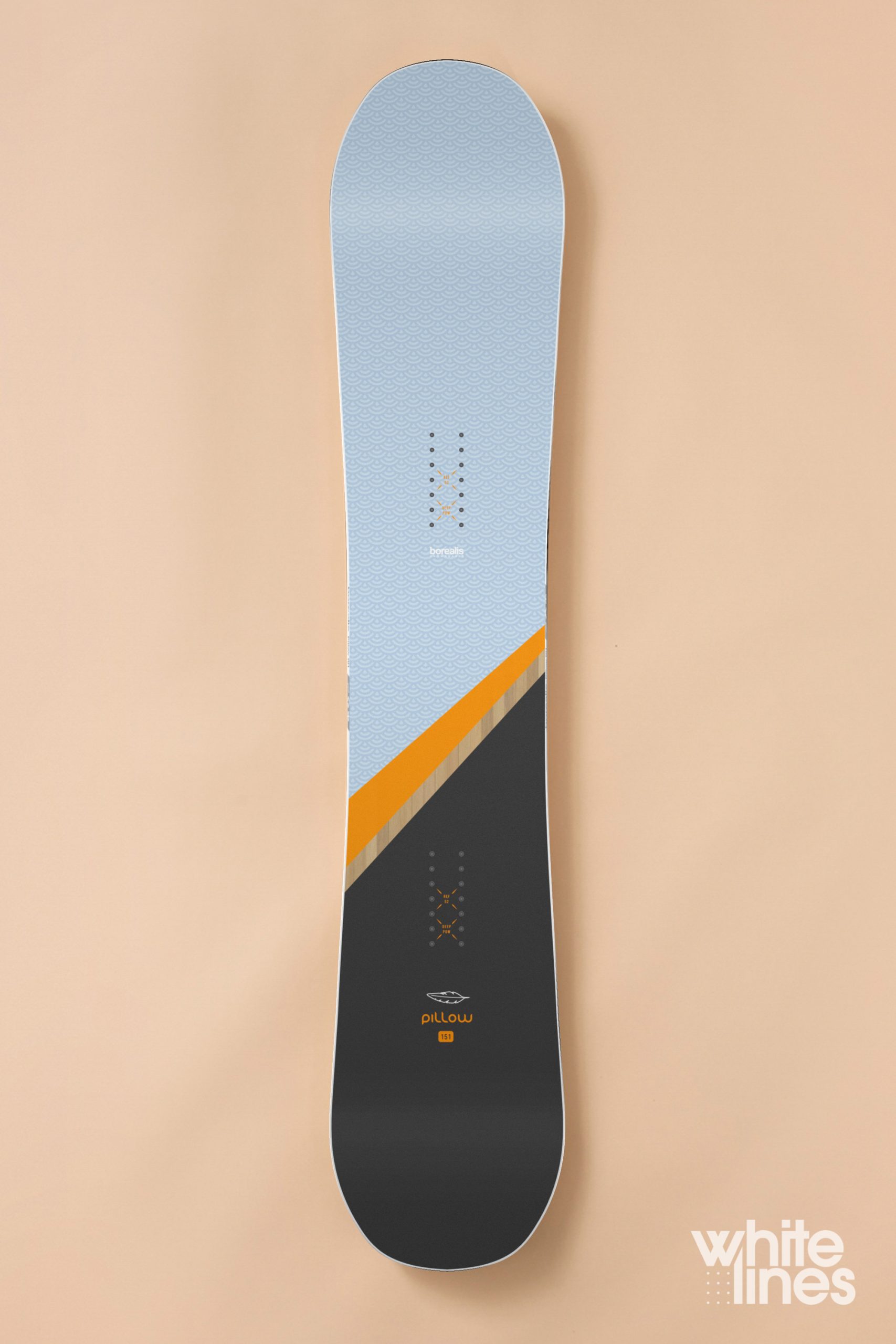 The flex rating of the Pillow sits at 7/10. Not a barn door by any means, but it’ll take an experienced rider to get the most out of it. The core is pretty lively, even for its featherlight weight, using a combination of poplar, paulownia and bamboo rods. That’s sandwiched between a layup of both triax and biax fibreglass sheets. These generate a really responsive torsional flex pattern without becoming so unwieldy that the board is limited to with flat-based riding or full tilt carving.