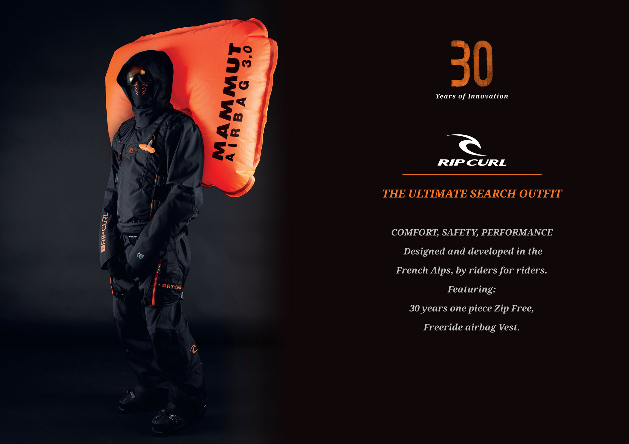 To mark this triple-decade occasion, Rip Curl have produced what they believe to be the Ultimate Search Outfit – a combination of pinnacle products (30 Years One Piece Zip Free and Freeride Airbag Vest). All of which combine to give serious backcountry Searchers the tools they need for the wildest weather conditions.