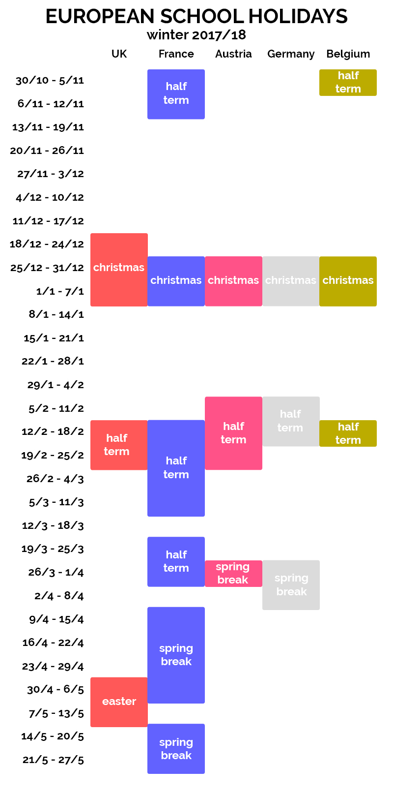 These five countries are the ones that, in our experiences, have the biggest presence on French and Austrian slopes, by far the two most popular ski holiday destinations in Europe. We came up with the graphic below to show exactly when each country’s school populations are let loose on the world, though to keep things simple we haven’t differentiated by region, i.e. we’ve just marked when school is out in France as a whole for half term, not by zone.