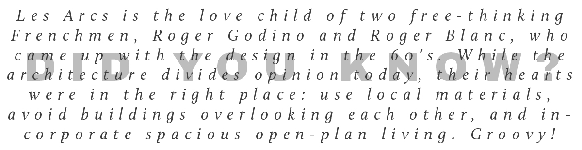All the villages are relatively separate and have fairly distinct identities: 1600 has quieter chalets nestled in the trees, 1800 is the livelier party place, 2000 is isolated and ugly but has the best access to great terrain. 1950, built by Intrawest (the company that owns Whistler and Stratton Mountain) is expensive but modern and by far the prettiest, with a 60-metre high waterfall as a backdrop. Les Arcs can provide fairly cheap self-catering holidays, with some great pistes, a decent park and some amazing freeriding. Which explains why it still remains one of the most popular destinations with British tourists.
