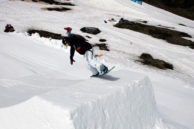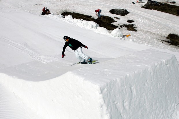 1. Approach the jump with your weight low and centred. It is possible to travel straight up the middle of the transition and launch into it, but to start with you’ll probably find it easier to do a ‘set-up turn’. Basically, on the way down the in-run, move from your toe edge to your heel edge, so you’re heading towards the jump slightly off centre (left if you’re regular, right if you’re goofy). As you hit the transition, move from your heels to a flat base but with your weight slightly over your toes. This whole approach should resemble a gentle ‘S’ curve, the idea simply being to set you up on the jump on your toe edge.