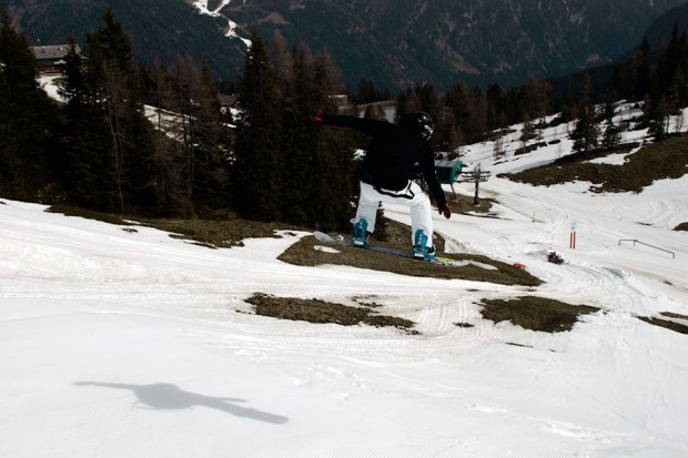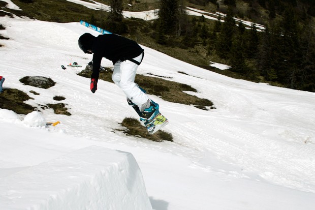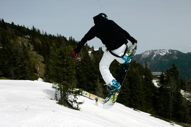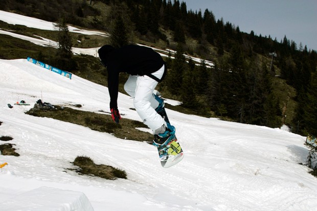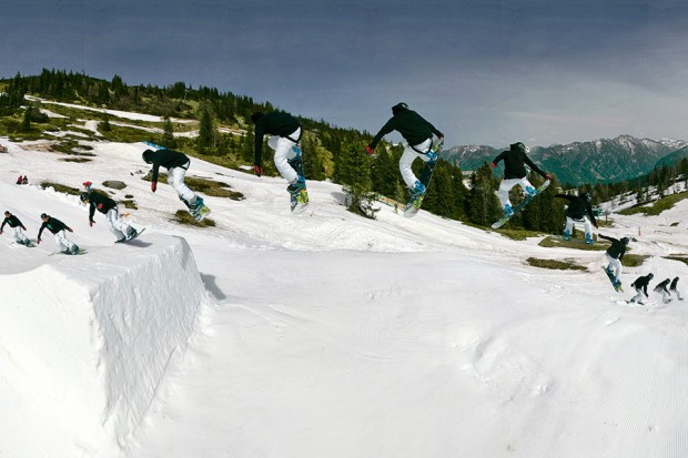 2. As with the 180, the important work is all done on the take-off. For a backside spin, stay low and drive your leading shoulder towards your back foot as you approach the lip. Try to dig your toe edge in a little so you’re spinning off a solid footing, and pop gently by extending your legs right at the final moment. Don’t start carving across the kicker too early, or you’ll drift sideways over the landing and maybe even fall off the side of the jump. The turn and pop should all happen right at the lip.