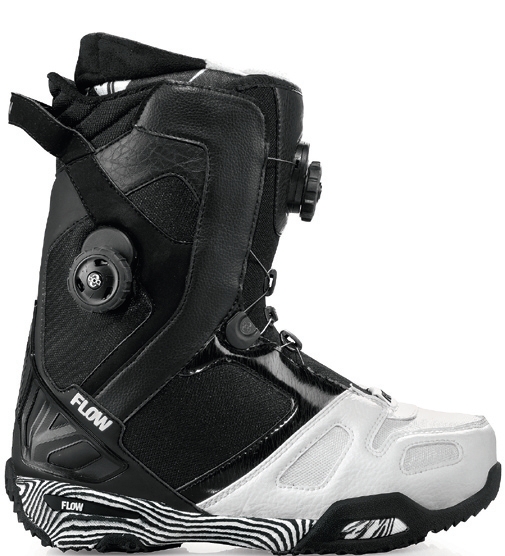 we say: This comes in towards the stiffer end of Flow’s range, but it’s still very much a freestyle focussed boot – it’s just designed for freestylers who hit big stuff, not novices. So cornices and cliff drops into powder, not dryslope boxes.