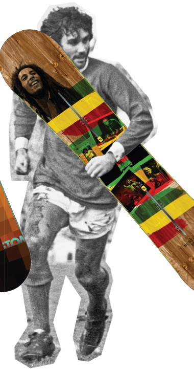 This is a special edition of Burton’s Whammy Bar. It has exactly the same spec as its more common cousin, it’s just got a graphic that is – how to put this – a whole lot more irie. Apparently all the pictures of Bob were taken at the legendary 1978 One Love Peace Concert, where Marley used music to bring together Jamaica’s warring factions to try and stop the killing that had almost claimed his own life two years earlier. But the best thing about this board is that the chilled rasta-man vibrations don’t just come from the graphic. It has Burton’s V-Rocker profile and a feature they call ‘Mid-spoon’ which raises the edges between the bindings, making them harder to catch. This, combined with the super-so fl ex, gives it a beautiful buttery feel that’s perfect for jibbing. It’s a bit twitchy for riding at really high speeds, but railriders will love the easy-going vibe. Read what our testers thought of this and other in our jib snowboard guide.